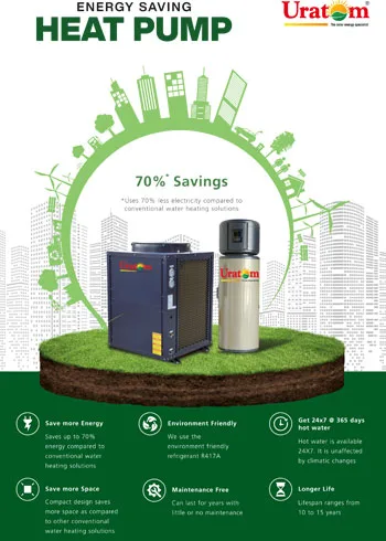 Uratom has developed a full range (from 200 Litres/hr To 1500 Litres/hr) of UHP water heating units built on heating optimized Special Compressors to provide seasonal efficient heating capacity and effective domestic hot water production in residential and commercial building applications. These are available for use with multiple refrigerants like R417A, R407C, R22, and R134A.